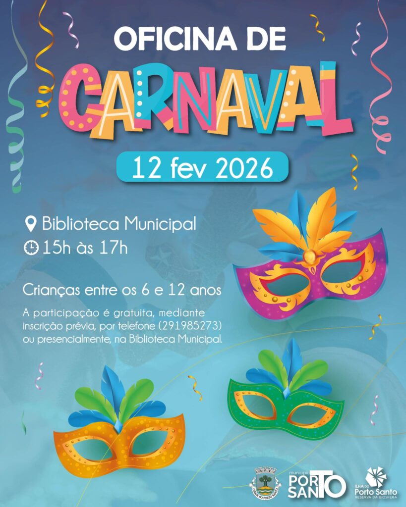 A Câmara Municipal do Porto Santo, através do Serviço Educativo da Biblioteca Municipal, irá promover a Oficina de Carnaval, que terá lugar no dia 12 de fevereiro, das 15:00 às 17:00 horas, nas instalações da Biblioteca, dirigida a crianças entre os 6 e os 12 anos, com a reutilização de diversos materiais.